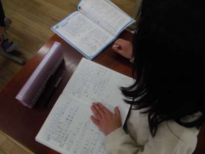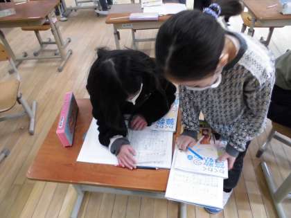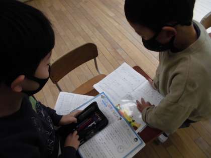 途中で,「こんな式と答えを書いている人がいるんだけど,どんな問題を作ったんだと思う。」と問うと「あっ,わかる。きっと・・・。」と式から問題を予想することもできました