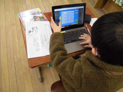 リーフレットの仕上に,「お話の国の国旗を表紙に載せたい。」や「お話の国らしい挿絵をかきたい。」ということで,タブレット端末を使った検索も使ってリーフレットに工夫を凝らしていました。