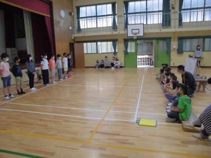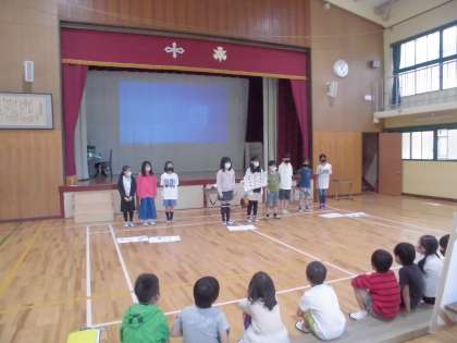 2年生から6年生までが,1年生が早く学校に慣れるように給食や学校のルール,先生についてなどクイズ等で1年生に伝えていました。6年生は,自分たちの特技を披露して「6年生になったらこんなことができるよ。と発表していました。