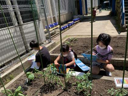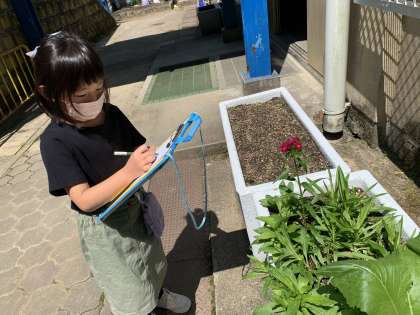 図工の学習で学校のなかにある咲いている植物や昆虫をスケッチしました。花や昆虫を見つけていくなかで初夏らしいものを見つけることができました。
