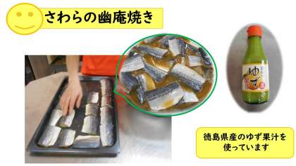 「幽庵焼き」とは, ゆず・料理酒・しょうゆで味をつけて焼く料理をいいます。給食では, さわらをゆず果汁・砂糖・しょうゆ等の調味液につけて下味をつけた後, スチームコンベクションオーブンで焼きます。ゆずのさっぱりとした味とさわやかな香りが楽しめる焼き魚です。