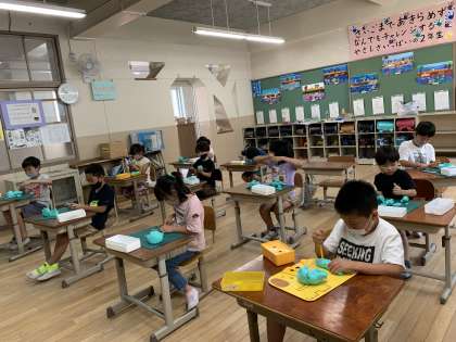 子ども達は「ねんどがかたい!」「さわったらきもちいい!」など楽しみながら作品をつくることができました。最後にできた作品をみんなで鑑賞し,自分の作品やお友達の作品の良いところを見つけることができました。