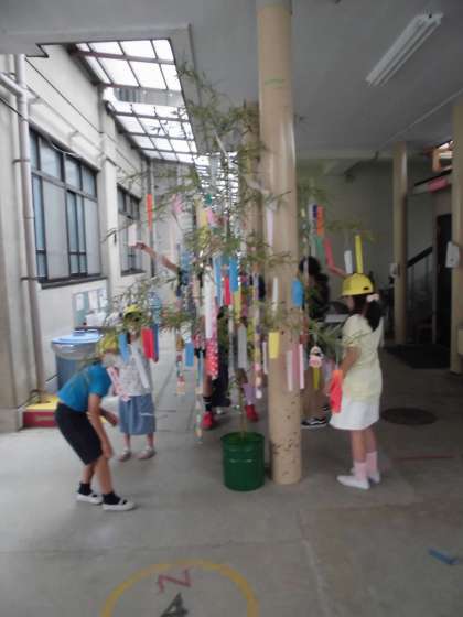 今,子どもたちの健やかな成長を願ったものや様々な願いが書かれた短冊が給食室前に飾られています。子どもたちも一人一人願い事をつるしました。地域のみなさんと七夕飾りでの交流が実現しました。