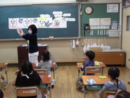 歯みがきの大切さを教えてもらいました。子どもたちは、一本一本ていねいにみがいていました。