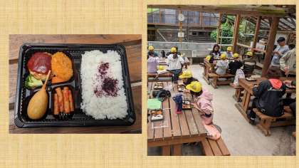 お天気が良くなってきたので、野外炊事上で昼食をとりました。なかなかボリュームのあるお弁当です。