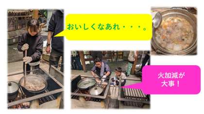 薪で火加減を調整し、一生懸命材料をかき混ぜながら、「すき焼き風煮」をつくりました。みんなで協力して作ったので、格別の味でした。てきぱきと後片付けをしました。