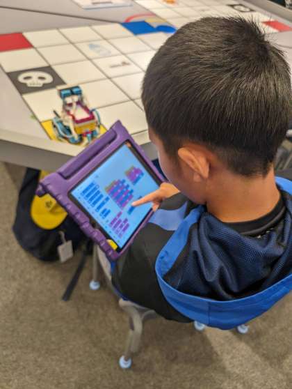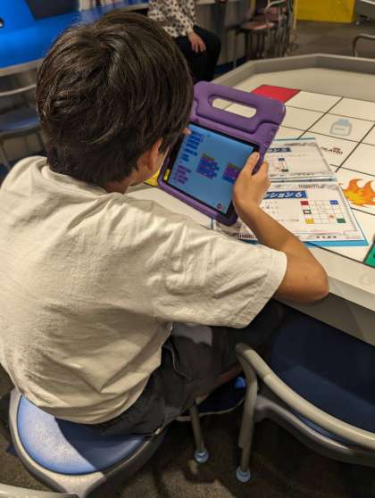 早速、プログラミング学習です。自分が出した通りに車が動くのがおもしろくて、夢中で取り組んでいます。
