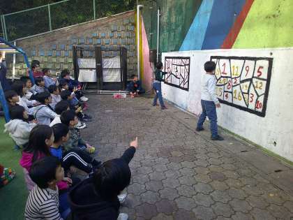 昨日出来上がったちびっ子広場の壁の作品のお披露目会を下級生に向けてすることになりました。