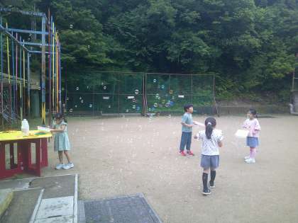 生活科の学習で「シャボン玉遊び」をしました。はじめはなかなかうまくいかなかった子ども達ですが、コツをつかんだら大きいシャボン玉や、たくさんのシャボン玉を作れるようになりました。子ども達はアイデアが豊富です。「シャボン玉かけっこ」や「シャボン玉の道」を作って楽しみました。
