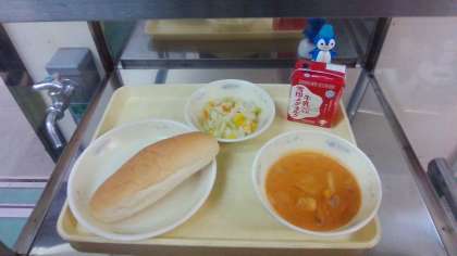 今日の献立は「コッペパン(国産小麦100%)・トマトクリームシチュー・野菜のソテー」でした。
