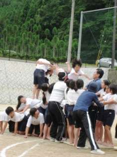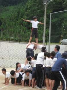 高学年の組体操。逆立ちの練習からしました。本当にできるのかしらと心配そうにしていた女子もいましたが,みんなで力を合わせてやり遂げました。