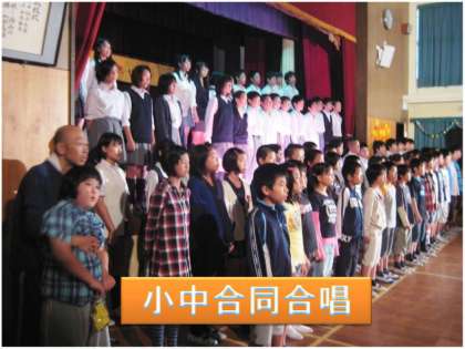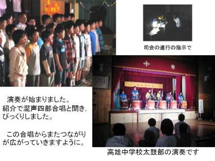 高雄中学校の文化祭に,5年生6年生の児童が出演しました。中学校の音楽の先生が5年生6年生の音楽の授業にも入っていただいていて指導をしていただきました。ありがとうございます。