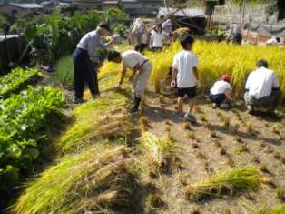 稲の刈り方を教えていただいたあと,子どもたちは初めてとは思えない手つきで上手に稲を刈って行き,約30分ほどですべて刈りあげました。
