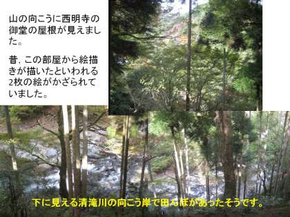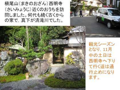 そこを訪れると,まず中村巡査部長に会いました。おはようございます。ごくろうさまです。と,あいさつを交わし,そのおうちを訪問しました。部屋には菊の紋章が入った金具がどの柱にも打ちつけられていました。そして清滝川は庭の借景になっていました。