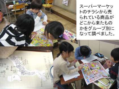 グループ別になって,スーパーマーケットのチラシに載っている商品がどこで作られているのか,どこから来たのかを調べました。チラシには熊本産とか北海道産とか書かれていたので,地図の都道府県のところに書き入れていきました。