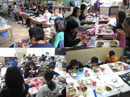 低学年が給食準備を終わりかけているころ高学年はというと,もうみんなでいただいていました。