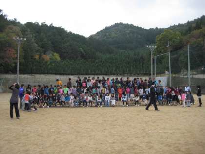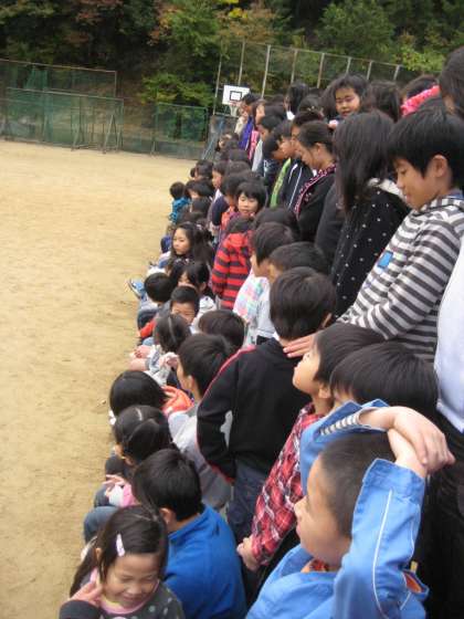 6年生の卒業記念アルバム作成のために,全校児童と教職員が運動場に出て,写真をとりました。曇り空のちょうどよい天気で,こんなふうにみんながそろって写真をとることは一年に一度のことです。どの子もいい顔で写ったかな。