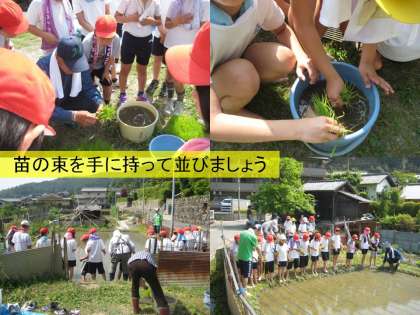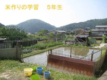 5月22日,校区で農業をしておられる山田さんご夫婦と福田さんに米作りの体験学習をさせていただきました。これからお米ができるまで学校での学習と今日の体験を通して勉強していきます。今日のお米はもち米を使っています。