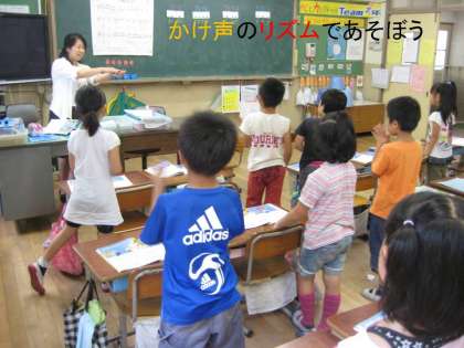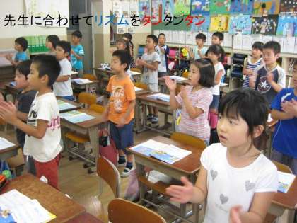 音楽の時間に先生の教えをよく聞いて,みんなでお祭りのリズムを手でとりながら歌いました。