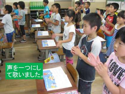 タンタン,タターンと,音の長さに注意して,先生のリズムと合わせるように前に集中して歌いました。子どもの声っていいですね。
