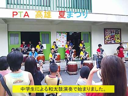 毎年,恒例の夏まつりが今年も行われました。オープニング・セレモニーは,高雄中学校生徒による和太鼓の演奏です。勢いよく鳴り響く和太鼓の音が山合いにこだましました。