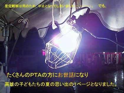 高雄中学校の先生が予定していた星空観察は,夕方からのにわか雨が止まず,中止となりました。ボランティアの方に遠くから来ていただいたのですが,講堂でお話を聞いて終わりました。また,機会があれば,高雄の空にうかぶ天の川や土星を見せてくださいね。ありがとうございます。