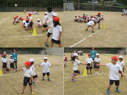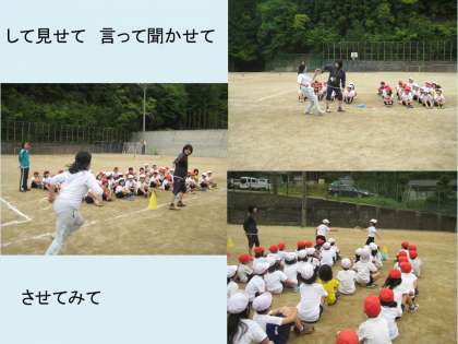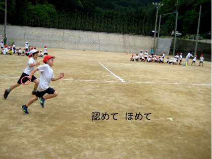 運動会を一か月後に迫り,各学年の体育学習も運動会の練習に向かい始めました。1年生と2年生がリレーの練習をするのに,リレーの方法と注意することを演じて見せてもらいました。その次に,子どもたちがやっているのを先生が見て,もう一つ注意すること,何度もして見せてもらい,してみてを繰り返し練習に励みました。練習の最後にはよく頑張ったこと,並び方,話の聞き方などたくさん認めてほめてもらいました。