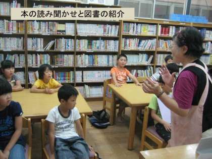 学習会が終わった後,図書室で本の読み聞かせと,図書室の使い方図書の選び方など,夏休みの自由研究などで情報を集める方法などを教えてもらいました。