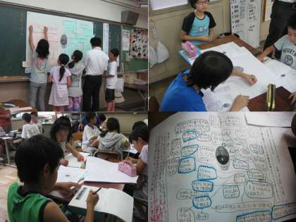5校時,5年生の国語の研究授業を行いました。「百年後のふるさとを守る」は,浜口儀兵衛の伝記物語です。作者は河田恵昭。読むことについて,小学校のこれまでの授業のあり方は変わってきています。子供が主体的に学習に向かう授業づくりを目指しています。そのために,今回,5年生はリーフレットづくりを単元を貫く言語活動におき,それにつながるための授業をしました。授業を観に来られた教職員,研修主事の西澤先生から,事後研究会の中で,子供たちがとてもよく頑張り,一人一人が一生懸命学習していたと,ほめてもらいました。