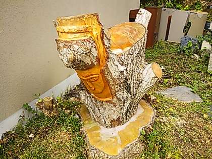 学校の正門を入ったところのイチョウの木が建物に触るほど大きく生長してしまったので,伐採しました。あとに残った木の幹を残していたら,なんだか心情的にやはり一緒に過ごしてきたイチョウの木。用務員さんが零細の時間に少しずつ彫刻をして,感謝の思いを彫りました。それが何に見えるかは観る人の自由です。