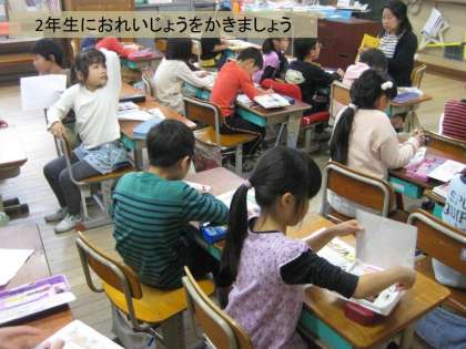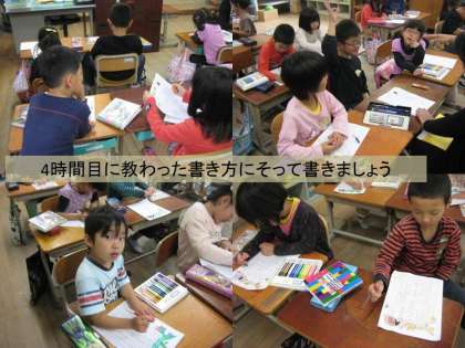 文を作り始めた1年生が三つの文で思いをつないで書くのは 時間がかかる学習です。でも,いっしょうけんめい書いていたので心はこもっています。