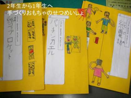 2年生から1年生へ「てづくりおもちゃのせつめいしょ」を書いて送りました。1年生はせつめいしょを一生懸命読んでおもちゃを手作りしました。1年生はこのせつめいしょを読んでわかってくれたと思います。