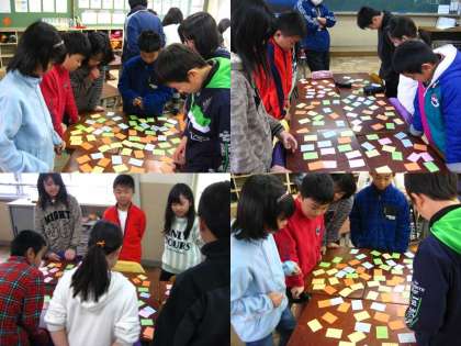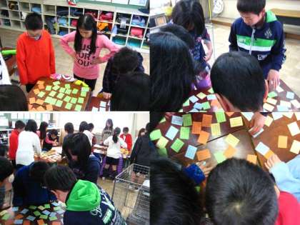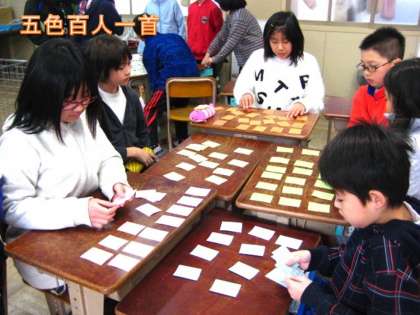 国語の時間の15分を使って3つのグループに分かれて百人一首をしました。ひらがなの文字だけが書かれています。コンピュータの画像から読み歌が流れてきます。下の句をしっかり聞いて札を探します。中には上の句を聞いて下の句を予想して札をとる子もいました。おうちでも家族でしていたのかな。かるたというと絵が描かれていてひらがな一文字が書かれてあるのを見つける遊びもありますが,百人一首は文字に親しむようになると,とてもおもしろいです。