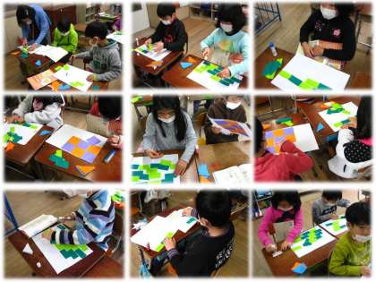 色紙を四角形や三角形に切って,規則正しいもようづくりをしました。重ねていくとおもしろい形ができてきますが,画用紙にきちんと貼っていくほど,歪みが気になるようです。むずかしさは簡単そうに見える中にありました。