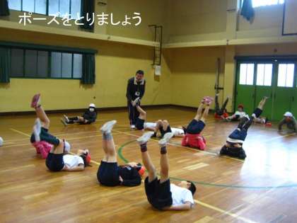 器械運動は,静止(ポーズ)が大切な動きの一つ。静と動の動きの中に美しさがあります。というと子どもたちには難しいですが,先生の手本も参考にして,背筋を伸ばして指先までピンと伸ばして止まる練習をしました。今日が第1回目でした。