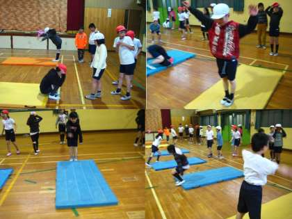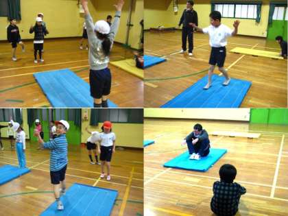 子どもたちはでんぐり返りや逆立ちのように身体を動かしまわすことが大好きです。マット運動の準備運動にも先生の指示に従って身体を動かそうとしていました。