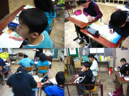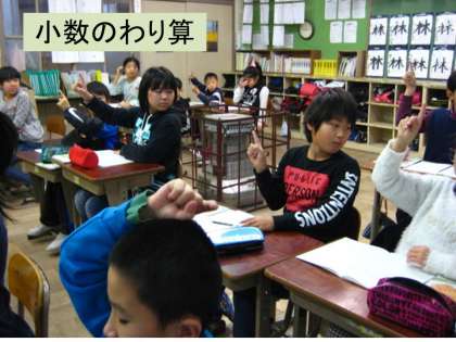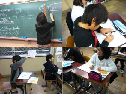 小数のわり算の学習に入ってきました。今日は問題作りから始まりました。7.2Lの豚汁が入ったなべと三つのなべを使って文章づくりです。問題づくりは,数値と数値のつながりをつかんでおく必要があります。