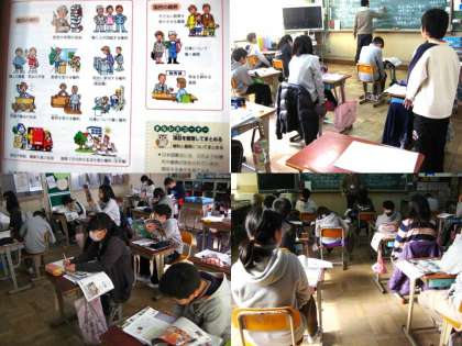 日本の歴史学習をしてきて,70年前に迎えた終戦と同時に作られた新しい日本国憲法について学習しています。三大原則といわれる基本的人権,国民主権.平和主義をもとに自由と責任,権利と義務について調べ学習をすすめました。黒板には「どうしてあたりまえのことが憲法で定められているのか考えよう」というめあてが書かれていましたが,子どもたちには日常の生活が当たりまえでも,世界中には,当たりまえでないことがいくつもあります。これからどんどん広がるだろうグローバル社会の中で,子どもたちは大きくなって世界から日本を見つめる目を持つようになるでしょう。