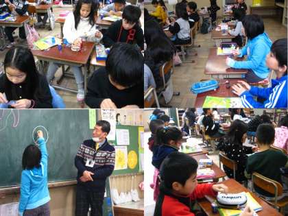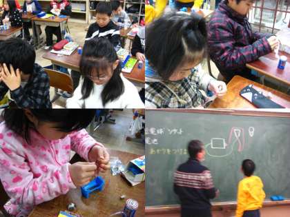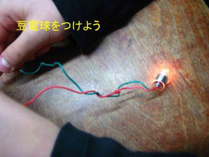 理科の実験で使うのは,単一乾電池と,豆電球とソケットです。間違いをおそれない子どもたちは次々に面白いつけ方を試みます。豆電球のはめ込み方がゆるかったり,エナメル線を乾電池につなげる場所がわからず片方にプラスとマイナスの線をいっしょにつないでみたりしました。