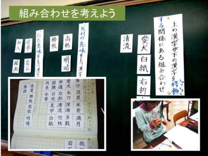 子どもたちは辞書で調べたり,自分の思いと友だちの思いをぶつけあったりして理解していました。ノートには黒板に貼られている漢字と同じ漢字を貼り付けていました。