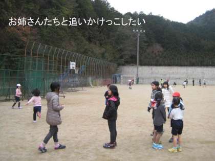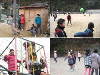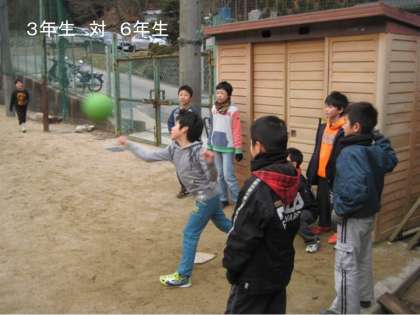 高雄小学校では伝統的に児童会のたてわり活動を行い,全校たてわり遠足,たてわり遊び,たてわりゲーム,きらきらなわとびなど行ってきていますが,毎日のように朝の自由時間に高学年と低中学年の子どもたちが仲よく遊んでいます。今日は,男の子は,3年生の子どもたちが6年生・5年生のお兄さんたちとハンドベースゲームの対戦をしていました。また,登り棒のそばでは,運動場に出てくる子たちが「よして」「いいよ」と言いながら遊びが広がっていきます。高学年のお姉さんたちと楽しそうに追いかけっこ遊びをする低学年の子どもたちもいました。