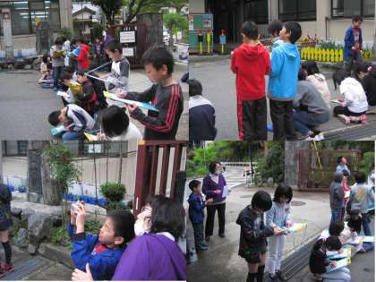 観察するときには,何か目印となる場所を選びます。子どもたちは先生の指示で,正門から見た講堂の屋根を目印としました。午前10時ごろは,昨日の天気がまだ残っていて,空は曇り空です。たんけんボードに記録しました。