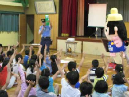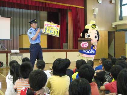 6月4日のお昼の集会のときに,子どもたちの安心・安全を守るために右京警察署の方がマスコットのポリスみやこちゃんを連れて,やってきてくれました。不審者に声をかけられたり,引っ張られそうになったら,大きな声をあげて助けをよび,子ども110番の家に飛び込んで警察に連絡してもらいましょう。帰りは必ず2人以上の友だちと集団で帰りましょう。夏休みまでまだ日にちはありますが,小学生の交通事故が増えています。毎日,交通安全には十分気をつけてください。
