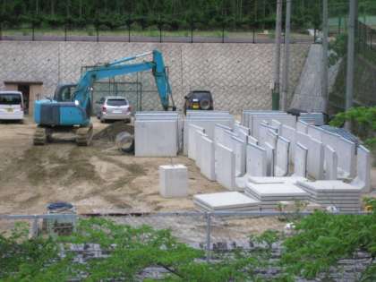 受注後,貯留槽を造り始め出来てきた貯留槽の部品が次々に運動場に運ばれてきました。側溝のパイプもようやく埋め込められ,道路側の集水桝は夜間工事で取り付け最中です。