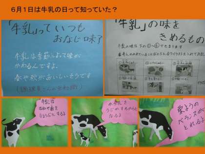 給食室のサービスホールに給食調理員さんから子どもたちにメッセージが掲げてあります。6月1日は牛乳の日。牛乳には,子どもたちの成長に欠かせないカルシウムやたんぱく質などの栄養がたっぷりです。また,育て方や季節によって少しずつ微妙に味がかわるのですね。