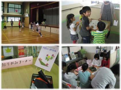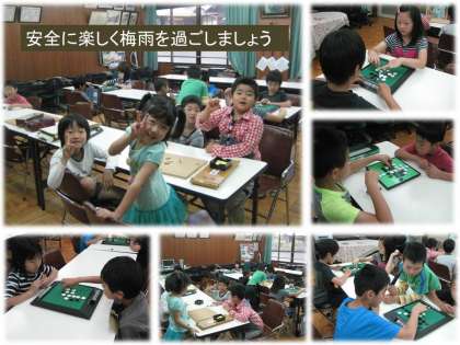 梅雨に入って雨の日は子どもたちはますます休み時間が過ごしにくくなります。教職員の中から,「会議室を開放して,土曜学習で使っている将棋やオセロを並べよう」「用務室の前におりがみコーナーを作ろう」「カロムを階段踊り場におこう」など,アイデアを出しあいました。講堂は,毎日休み時間は学年別に開放しています。