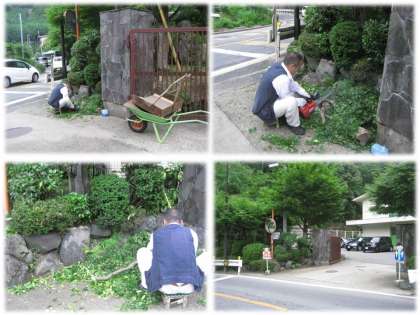 蒸し暑くなってくるとうっそうとした木を見ても蒸し暑く感じます。学校玄関口でだいぶん緑が濃くなってきた木々が用務員さんに剪定してもらっていました。すっきりして,風が通り,木も涼しそうです。