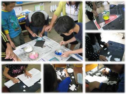 5年生も6年生も図画工作のお話の絵では宇宙の物語に挑戦しています。高学年になってくると,宇宙は真っ暗な中に星がいっぱいあるというだけでは満足できなくなってきます。いろいろな資料を見たときに「こんな表現をしたい」と思っても限られた時間内で,何万もの星粒を筆では描き切れません。技術の問題があります。でも,なんとかそのように表現できないものかと思っているに違いないと,指導者が考えます。