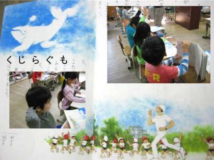 先生と一緒に運動場に出ていたら,大きな「くじらぐも」が向こうの空からやってきて,子どもたちの真上で止まりました。
