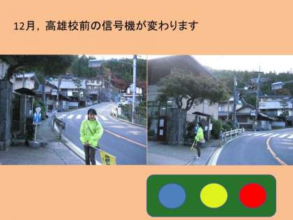 学校の前の信号機のところはちょうどS字のカーブになっており,栂ノ尾方面へ行くドライバーの中には,ときおり予告信号に気付かず,児童が横断歩道を渡っているのに気付いてから急ブレーキをかけることもあり,以前から心配の種ですが,今度,正式に信号機が変わるという連絡がありました。